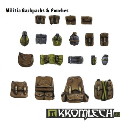 This set contains 38 various upgrade pieces (19 different designs) for futuristic human militia. You get backpacks, pouches, canteens, mess kit, grenades and more. All suitable for 28mm miniatures.