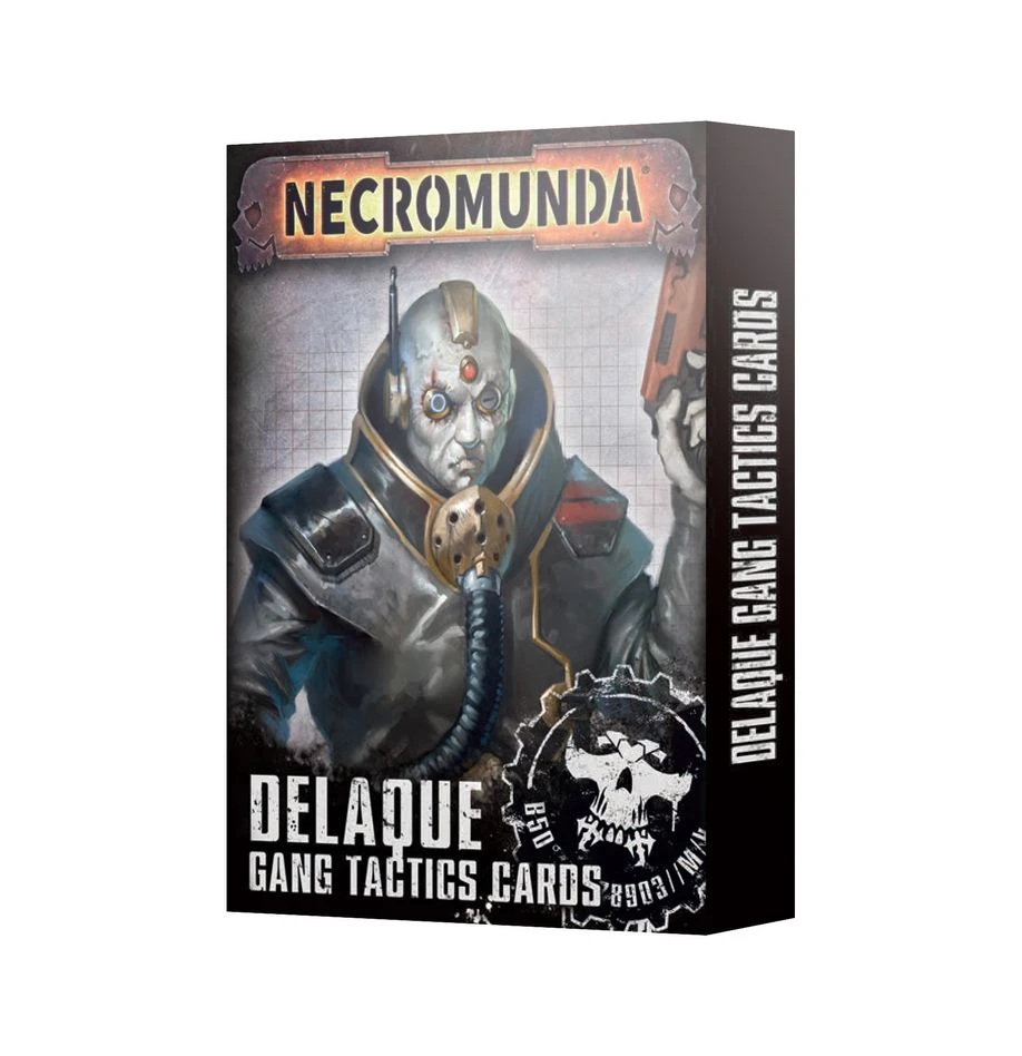 – 18x Delaque Gang Tactics cards, which detail tactics for the exclusive use of House Delaque gangs