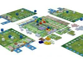 In the game, you expand your colony by placing Tetris-like pieces with buildings on your colony board. Dice (representing migrant workers) are used to activate buildings; each die activates a complete row or column of buildings in your colony. The buildings are activated in order (left to right / top to bottom), then the die is placed on the last activated building to block this space. It is therefore crucial where you put new buildings in your colony, and in which order you use the dice.